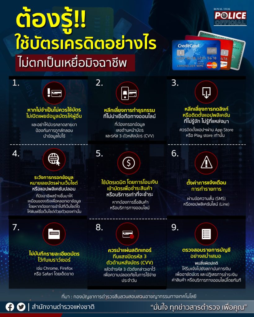 1.หากไม่จำเป็นไม่ควรใช้บัตร ไม่เปิดเผยข้อมูลบัตรให้ผู้อื่น และอย่าให้บัตรคลาดสายตา ป้องกันการถูกลักลอบนำข้อมูลไปใช้