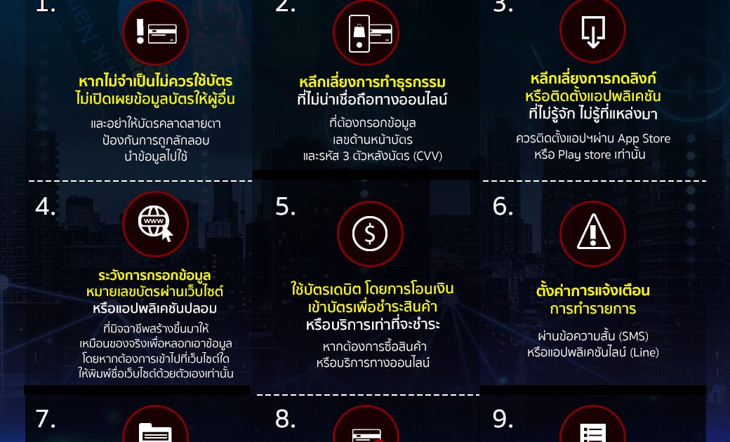 1.หากไม่จำเป็นไม่ควรใช้บัตร ไม่เปิดเผยข้อมูลบัตรให้ผู้อื่น และอย่าให้บัตรคลาดสายตา ป้องกันการถูกลักลอบนำข้อมูลไปใช้