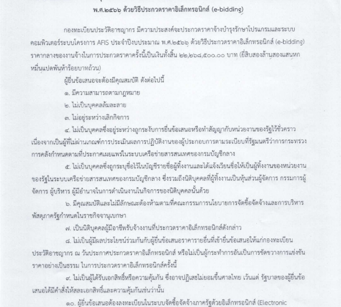 ประกาศกองทะเบียนประวัติอาชญากร เรื่อง ประกวดราคาจ้างบำรุงรักษาโปรแกรมและระบบคอมพิวเตอร์ระบบโครงการ AFIS ประจำปีงบประมาณ พ.ศ.2566 ด้วยวิธีประกวดราคาอิเล็กทรอนิกส์ (e-bidding)