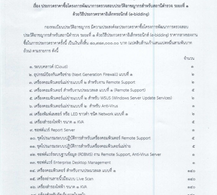 ประกาศกองทะเบียนประวัติอาชญากร เรื่อง ประกวดราคาซื้อโครงการพัฒนาการ ตรวจสอบประวัติอาชญากรสำหรับสถานีตำรวจ ระยะที่1 ด้วยวิธีประกวดราคาอิเล็กทรอนิกส์ (e-bidding)
