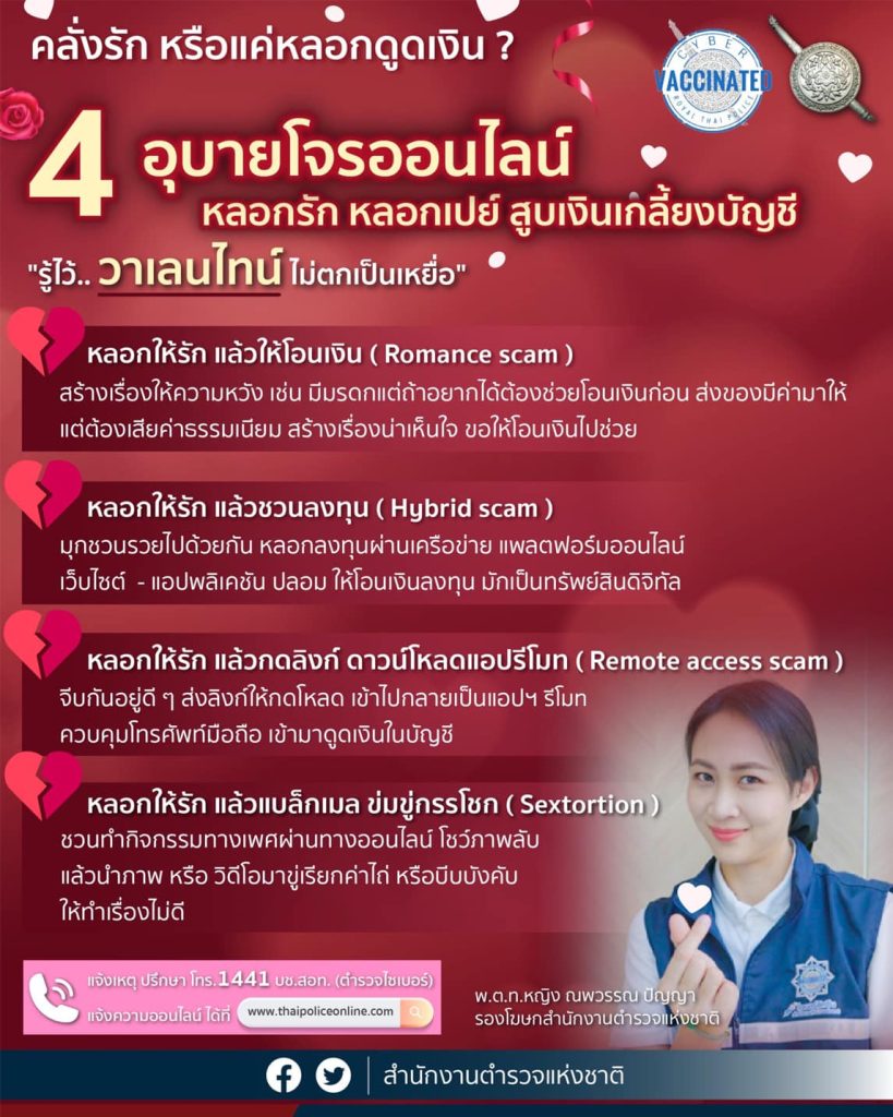 “รองฯ ลูกขวัญ” พ.ต.ท.หญิง ณพวรรณ ปัญญา รองโฆษกสำนักงานตำรวจแห่งชาติ เตือนภัย 4 อุบายโจร หลอกรัก หลอกเปย์ สูบเงินเกลี้ยงบัญชี