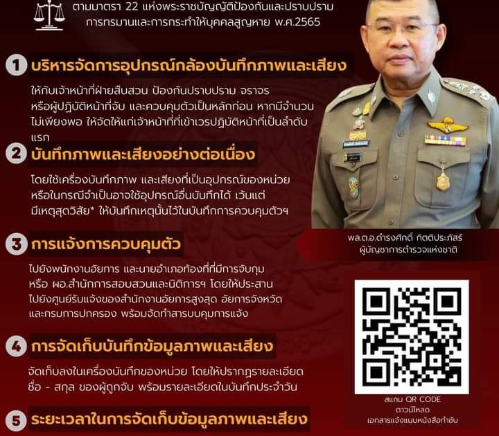 พล.ต.อ.ดำรงศักดิ์ กิตติประภัสร์ ผบ.ตร. กำชับ “แนวทางการปฏิบัติเกี่ยวกับการบันทึกภาพและเสียงในขณะจับและควบคุมตัวตามมาตรา 22 แห่ง พ.ร.บ.ป้องกันและปราบปรามการทรมานและการกระทำให้บุคคลสูญหาย พ.ศ.2565”