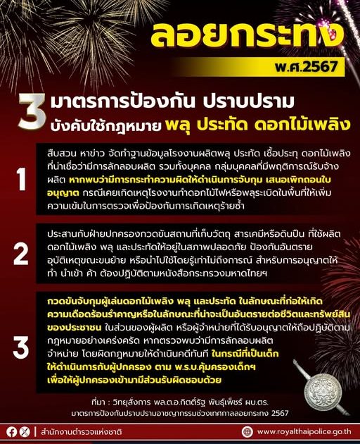 สำนักงานตำรวจแห่งชาติ ออก 3 มาตรการป้องกัน ปราบปราม บังคับใช้กฎหมาย เกี่ยวกับ “พลุ ประทัด ดอกไม้ไฟ” เพื่อความปลอดภัยในชีวิตและทรัพย์สินของประชาชน